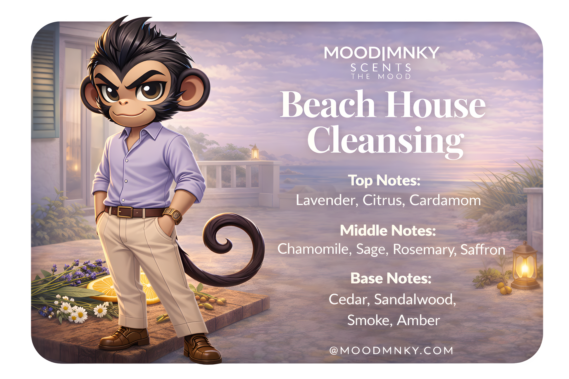 Bring the refreshing atmosphere of a familiar summer beach house to your home with our Beach House Cleansing candle fragrance. This captivating scent is inspired by the invigorating sea breeze and the soothing scent of lavender that you find in a beach house on the coast.